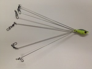 Skoolin Rig, Chartreuse,, The castable umbrella rig has taken the bass fishing world by storm in a matter of a few months. "The Alabama Rig" was first on the scene and we are now seeing variations of the original from many tackle companies. The "Skoolin' Rig" features several improvements that make it far superior to the rest. The 100% stainless wires are extremely durable and will withstand numerous opening and closings without breaking. The addition of a split-ring which can be slid down the length of the wires dur